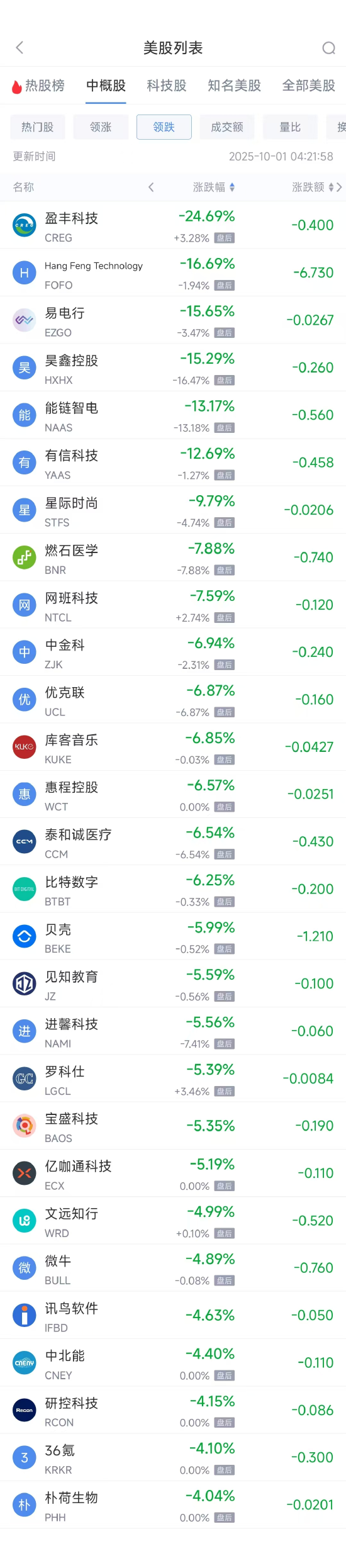 下跌股当中(按市值从高到低),阿里巴巴跌0.67%,京东跌1.85%,携程跌1.23%,百度跌2.29%,腾讯音乐跌1.66%,中华电信跌0.16%,日月光半导体跌0.36%,贝壳跌5.99%,联电跌0.13%,中通跌1.94%,满帮跌0.88%,华住酒店集团跌1.78%,BOSS直聘跌0.34%,中国新城农村跌1.81%,新东方跌1.04%,小马智行跌1.01%,万国数据跌3.18%,微牛跌4.89%。